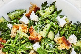 Crunchy snap peas, tangy buttermilk dressing, and golden bread cubes.