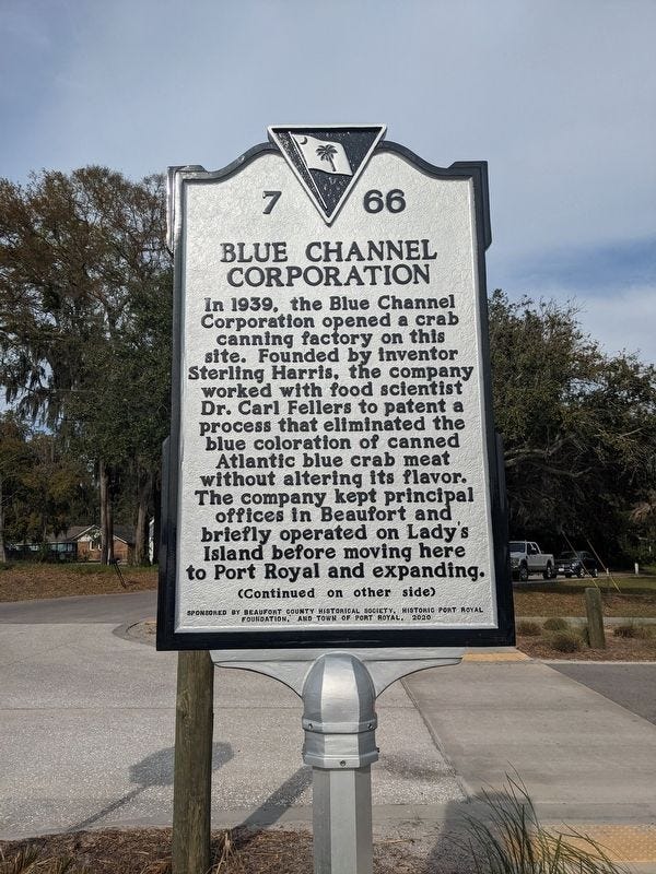 Founded by inventor Sterling Harris, the Blue Channel Crab company worked with food scientist Dr. Carl Fellers to patent a process that eliminated the blue coloration of canned Atlantic blue crab meat without altering its flavor. The company kept principal offices in Beaufort and briefly operated on Lady's Island before moving to Port Royal and expanding.