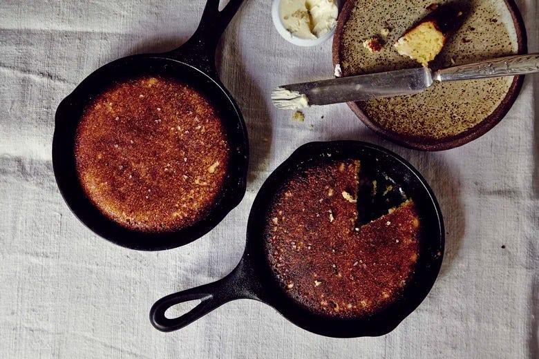 Cornbread has to have the tang of good buttermilk and a cast-iron skillet with some smokin’ hot grease from Allan Benton’s smokehouse bacon. Use very high heat so hot that the batter sizzles as it hits the pan.