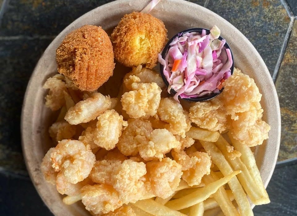 As you wait, the air fills with the aroma of sizzling shrimp and seasoned fish. There is something unmistakably superior about seafood just off the boat. The shrimp are sweeter, with a delicate crunch from a light, golden breading that lets the natural flavor lead. It is “coast-crispy,” salty, and deeply satisfying.