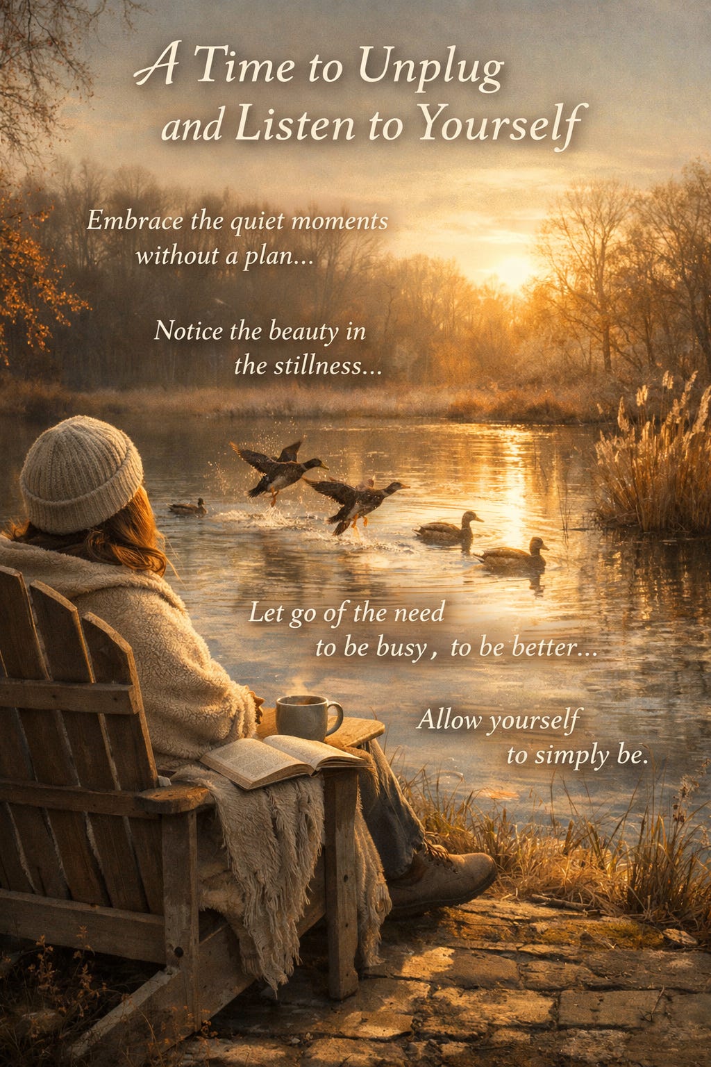 In the stillness, I begin to notice things I usually rush past. The way the ducks lift off from the water, wings wide and deliberate, gliding in slow circles before landing softly on the pond out back. The sound is gentle, almost ceremonial. The winter light hits the water just right, illuminating the surface until everything seems hushed and holy, as if the world itself has decided to pause.
